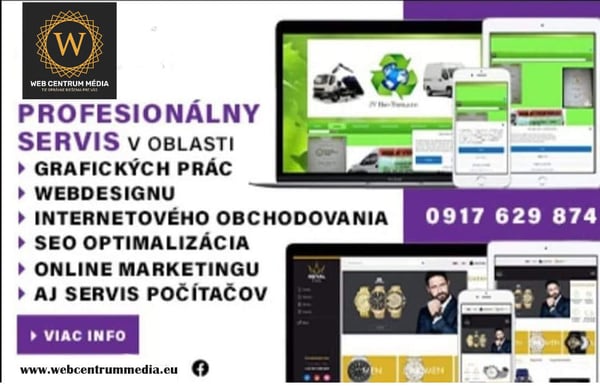 Sme Web centum media a vieme vám poskytnúť komplexný servis v oblasti grafiky, webdesignu a tiež aj v oblasti internetového obchodovania. Pokiaľ potrebujete návrh loga alebo vytvoriť celkovú identitu vašej značke, garantujeme vám že ste presne na tom správnom mieste. Nachádzame sa v Partizánskom a otváracie hodiny máme od 9,00 h do 17,00 h každý pracovný deň. Dokonca nás viete zastihnúť aj v sobotu od 9,00 h do 13,00 h.Z oblasti tvorby stránok a výroby loga máme bohaté a tiež dlhoročné skúsenosti. Dokážeme pútavo a veľmi prehľadne navrhnúť váš web a úspešne spustiť vašu SEO optimalizáciu. Naša spoločnosť je nastavená tak, že vám poskytne naozaj široké portfólio služieb a vy budete jednoznačne spokojnými zákazníkmi. Obráťte sa na nás, jednoznačne vás nesklameme.Poskytujeme vám skvelé a profesionálne služby, medzi ktoré patria:- Tvorba web stránok- Tvorba pútavého moderného webu pre Vás či Vašu spoločnosť- Tvorba pútavého e-shopu- Tvorba grafiky- Tvorba letákov, brožúr a vizitiekSpoľahnite sa ešte dnes na náš šikovný tím, ktorý vám dokáže pomôcť s propagáciou vašej novej spoločnosti alebo firmy. Sme tu pre vás a snažíme sa posunúť vaše podnikanie na úplne iný nový level. Okrem bežných marketingových služieb, ktoré sme spomenuli máme k dispozícií aj množstvo doplnkových služieb. Jedná sa najmä o služby informačných technológií. Sú nimi inštalácia PC, reinštalácia PC, odvírenie PC alebo inštalácia hardwaru či software a podobne.Kontaktujte náš tím prostredníctvom emailu alebo telefónneho čísla. Navštíviť môžete aj náš web, na ktorom sa dozviete všetky bližšie detaily o našich ponúkaných službách. Sme si istí, že vám dokážeme pomôcť v plnom rozsahu a obslúžiť vás, čo najrýchlejšie. Spoľahnite sa na nás, my vám zaručíme profesionálne a veľmi príjemné a individuálne vystupovanie.